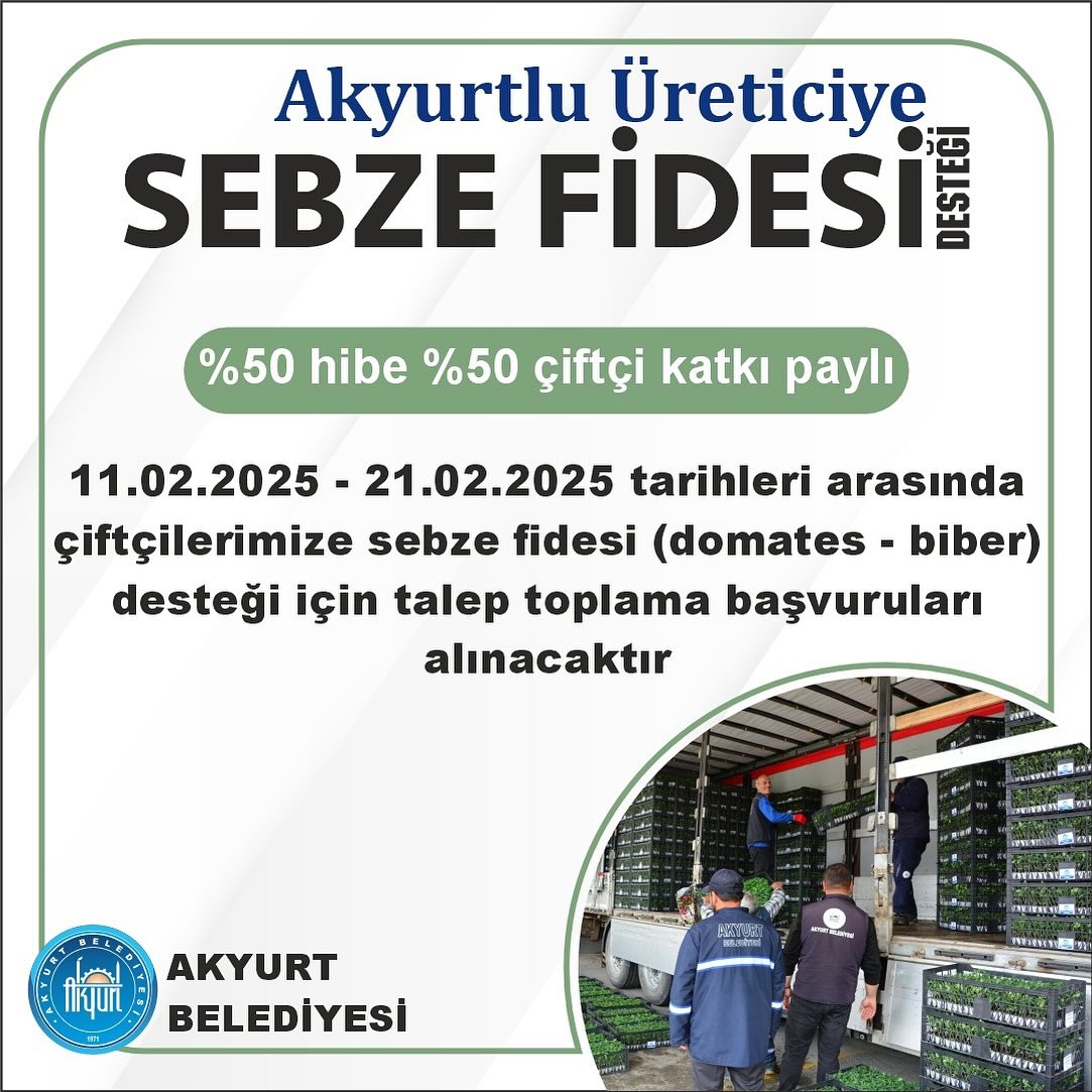 Akyurt Belediyesi’nin çiftçilere yönelik başlattığı sebze fidesi dağıtım programı için başvurular, 11 Şubat 2025 tarihinde başladı. 21 Şubat 2025 tarihine kadar devam edecek başvurular, mesai saatleri içinde (08:00-17:00) Akyurt Belediyesi Lojistik Tesisleri Park ve Bahçeler Müdürlüğü'ne yapılabilecek.