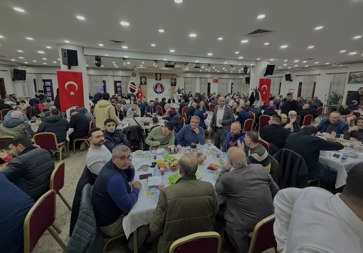 Ramazan ayının ruhuna uygun şekilde düzenlenen iftar programına yaklaşık 600 kişi katıldı. Yoğun katılım nedeniyle iki katlı salon tamamen dolarken, yer kalmayan alanlarda yer sofraları kurularak geleneksel bir Ramazan atmosferi oluşturuldu.