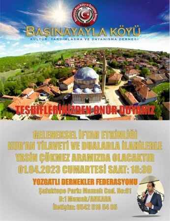 Başınayayla Köyü Derneği tarafından Ankara Yozgatlı Dernekler Federasyonu Binasında iftar proğramı etkinliği gerçekleştirilecek.