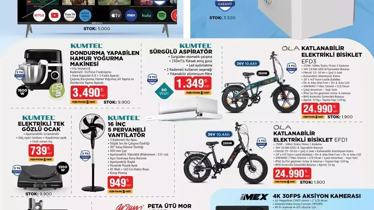 8 Ağustos Cuma günü ise teknoloji ve küçük ev aletleri ön plana çıkıyor. Katlanabilir elektrikli bisiklet 24.990 TL, 50 inç QLED Google TV 13.490 TL, buz makinesi 3.490 TL, hamur yoğurma ve dondurma yapabilen makine 3.490 TL, şarjlı süpürge 4.999 TL, Arzum ütü 899 TL, aksiyon kamerası 1.790 TL gibi ürünler raflarda olacak.