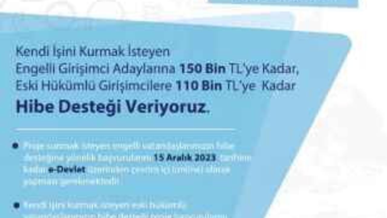 Türkiye İş Kurumu Genel Müdürlüğü'nün finanse ettiği, engelli ve eski hükümlü bireylerin iş gücü piyasasına katılımını destekleyen hibe programında başvuru süreci devam ediyor. Girişimci ruhlarını ve üretim potansiyellerini sergileyecek projeler için teklifler, 15 Aralık 2023 tarihine kadar saat 23:59'a kadar e-Devlet kapısı üzerinden online olarak alınacak.