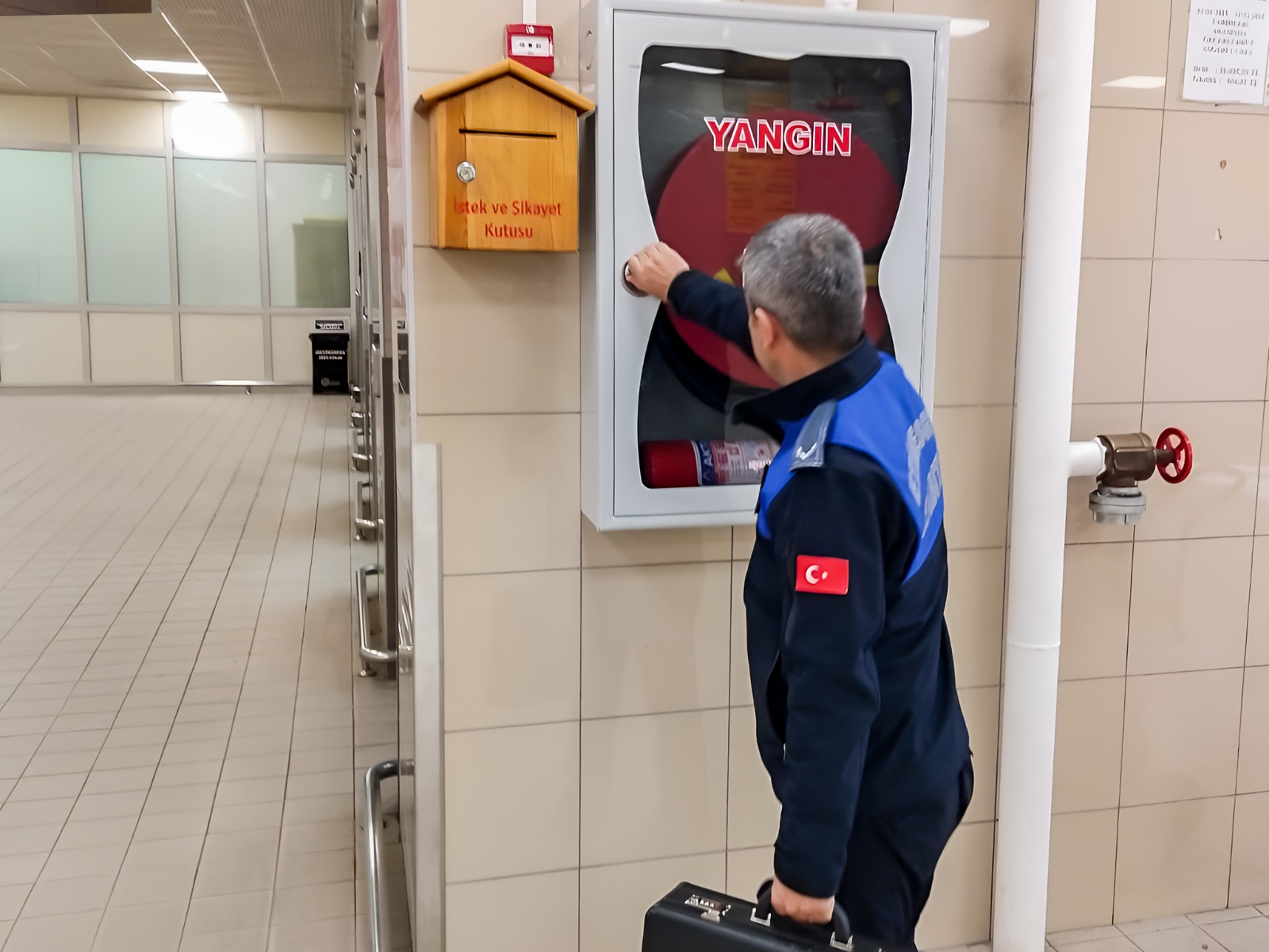 Denetimler kapsamında yangın güvenlik ekipmanları titizlikle kontrol edilerek olası yangın risklerine karşı önlemler artırılıyor.