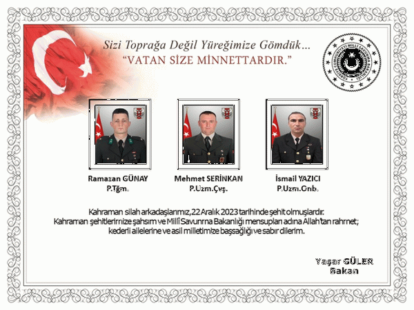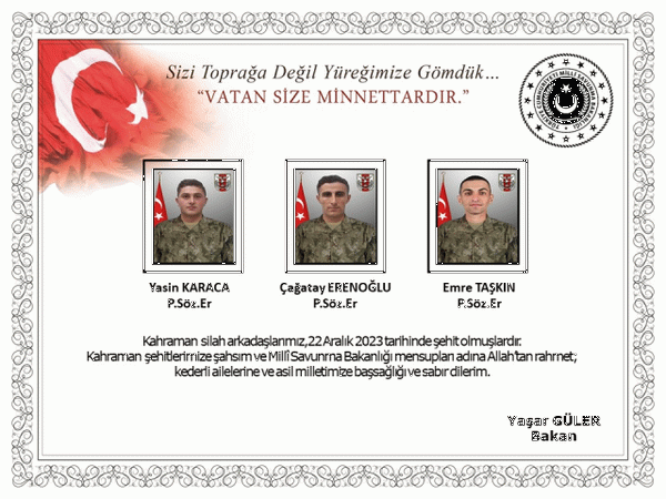 Irak'ın kuzeyindeki bölücü terör örgütünün saldırısında şehit düşen askerler arasında bulunan Piyade Sözleşmeli Er Yasin Karaca'nın kimliği açıklandı. Milli Savunma Bakanı Yaşar Güler, 6 Ocak'ta gerçekleşen saldırı sonucunda hayatını kaybeden kahraman askerlerin isimlerini duyurarak, şehitlerimize Allah'tan rahmet diledi.