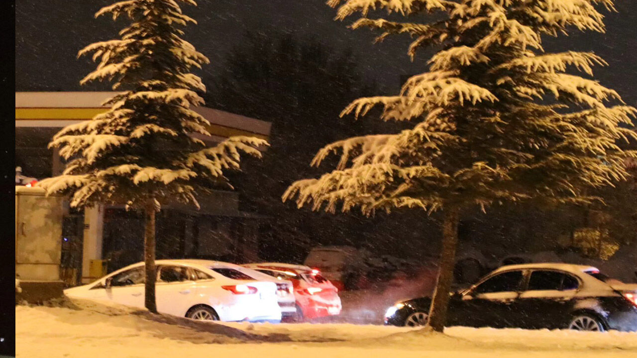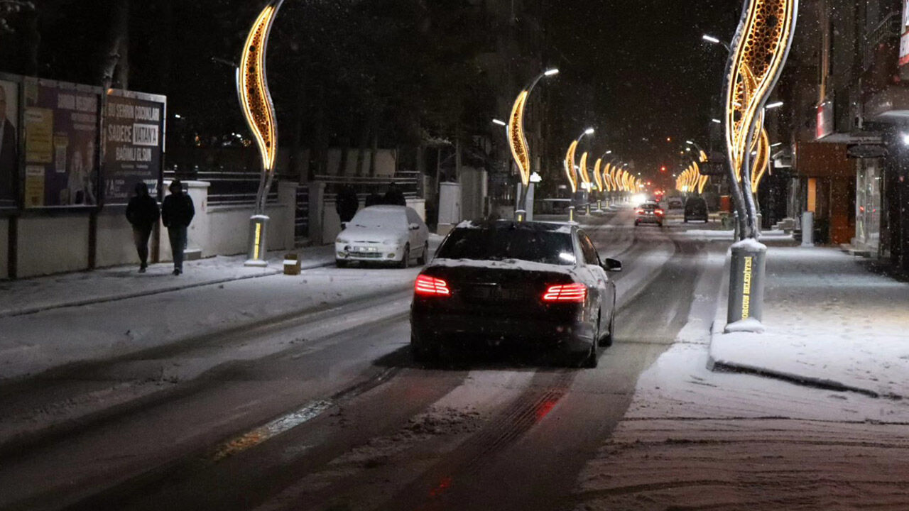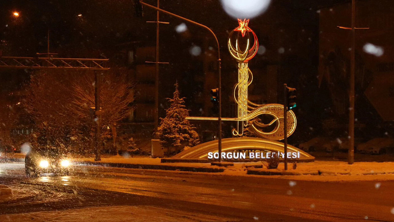 Sorgun’un ana caddesi karla kaplandı, ağaçlar ve sokak lambaları beyaz örtüyle süslendi.