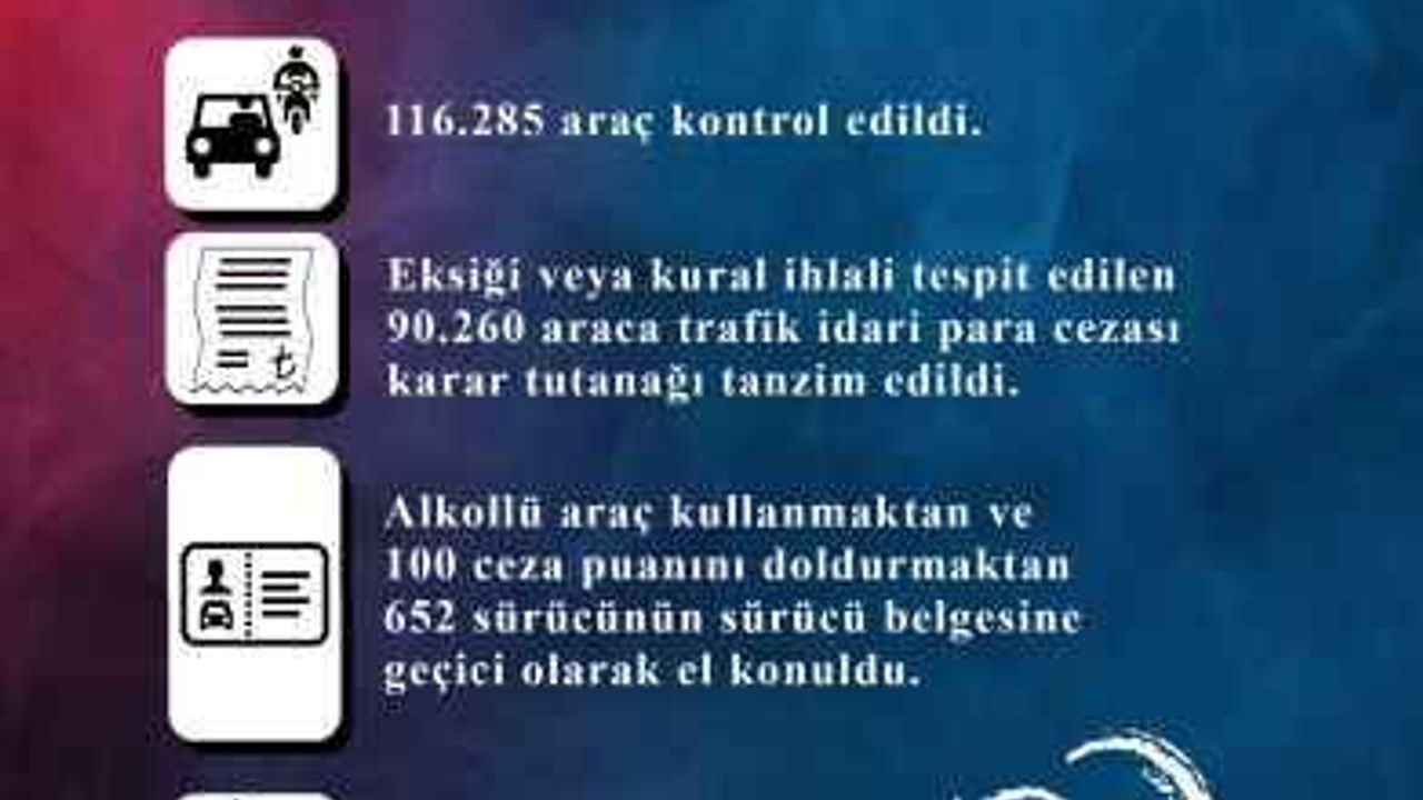 Ekim tarihleri arasında yapılan çalışmalarda 116 bin 285 araç kontrol edildiğini ve yapılan bu kontrollerde eksiği bulunan 90 bin 260 araca idari para cezası kesildiği, alkollü araç kullanmaktan ve 100 ceza puanını doldurmaktan 652 sürücünün sürücü belgesine geçici olarak el konulurken, bin 159 araç da çeşitli suçlardan trafikten men edildi” ifadelerine yer verildi.