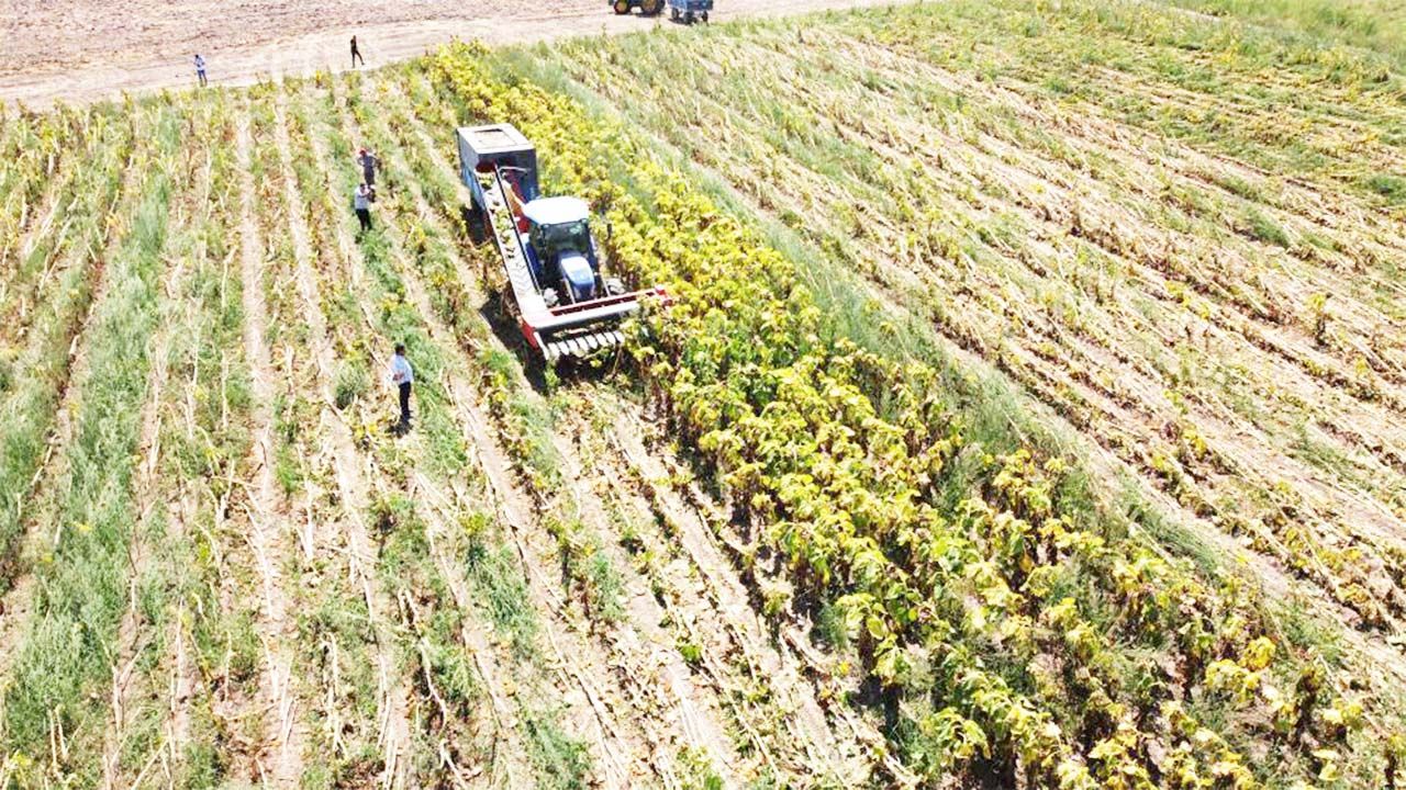 Dron kamerasıyla görüntülenen hasat çalışmalarında çiftçiler, olgunlaşan çekirdekleri toplayarak kurutmak üzere harman yerlerine taşımaya başladı.