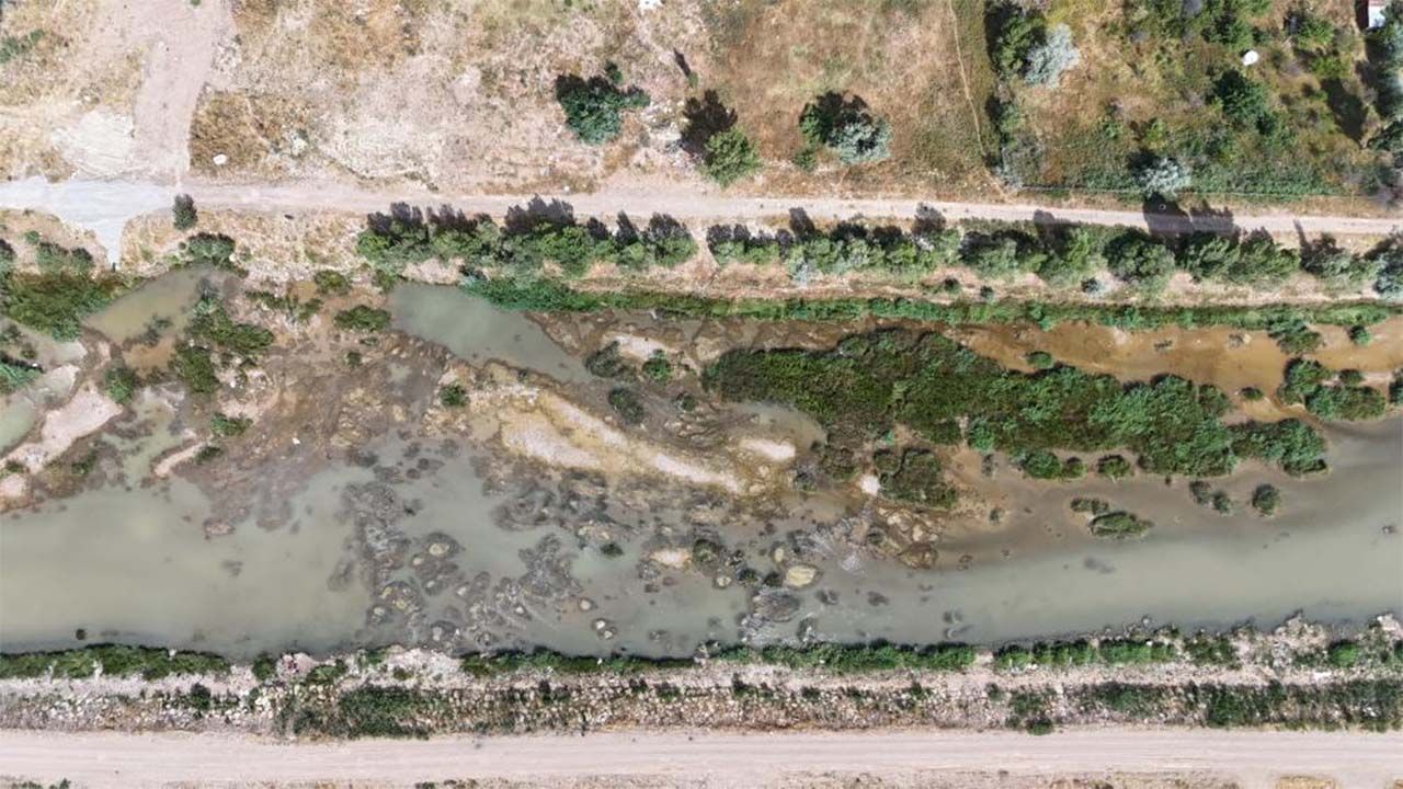 Dron ile kaydedilen görüntüler, Kızılırmak’ın birçok noktasında kuruyan yatakları ve sazlıklarla kaplanan alanları gözler önüne serdi.