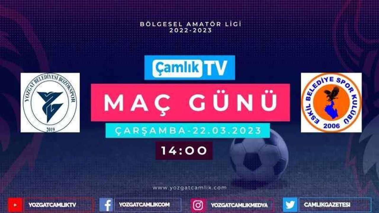Yozgat Şehir Statyumu Dış sahada 22 Mart 2023 Çarşamba günü 14.00'da başlayacak olan - Yozgat Belediyesi Bozokspor- Eskil Belediyespor maçı Yozgat Çamlık Tv ekranlarında Barış Akot'un sunumu ile gerçekleşecek.