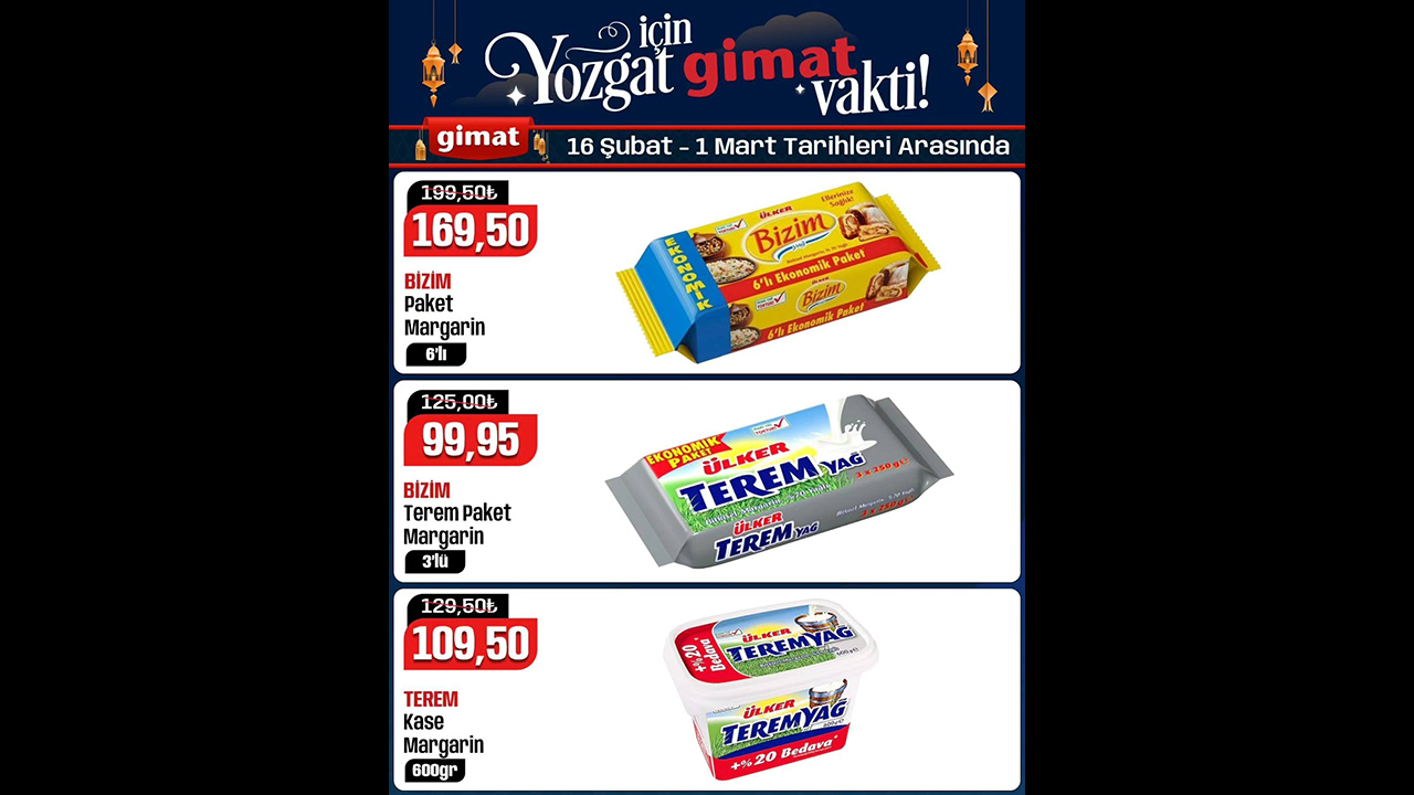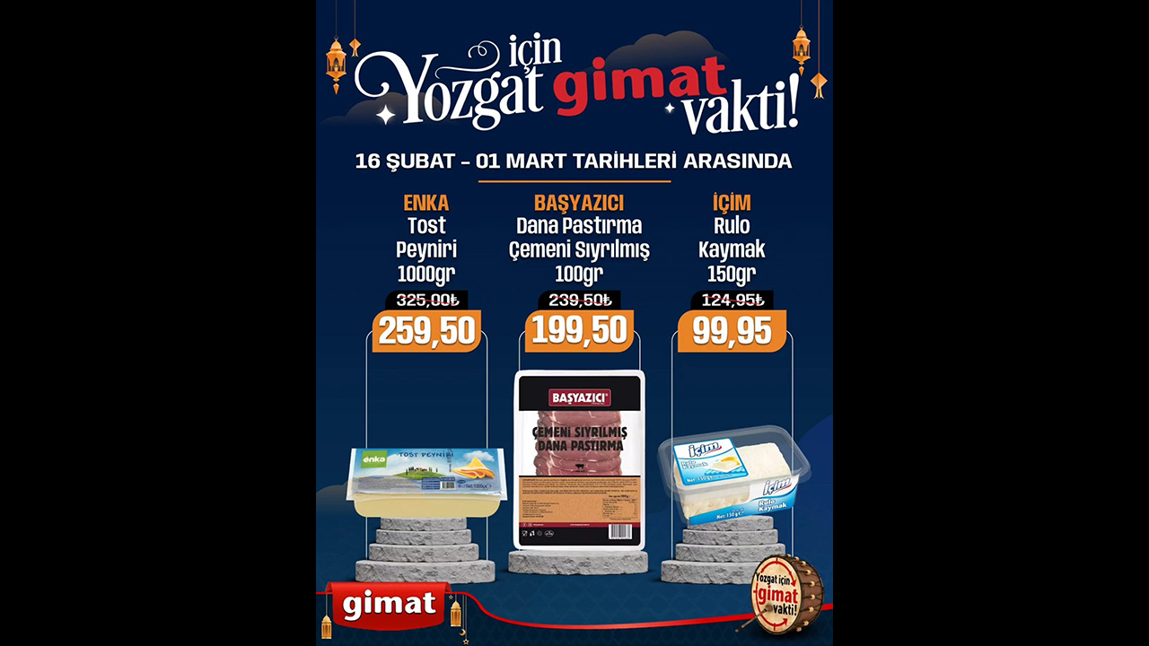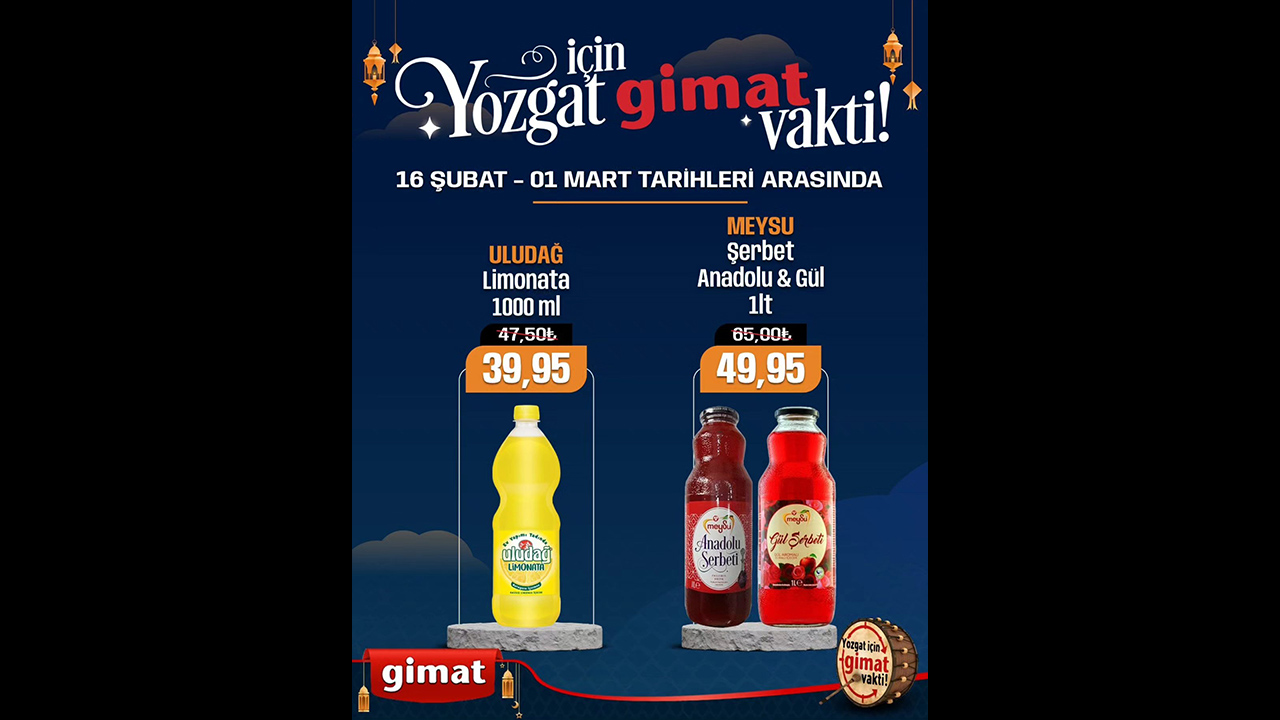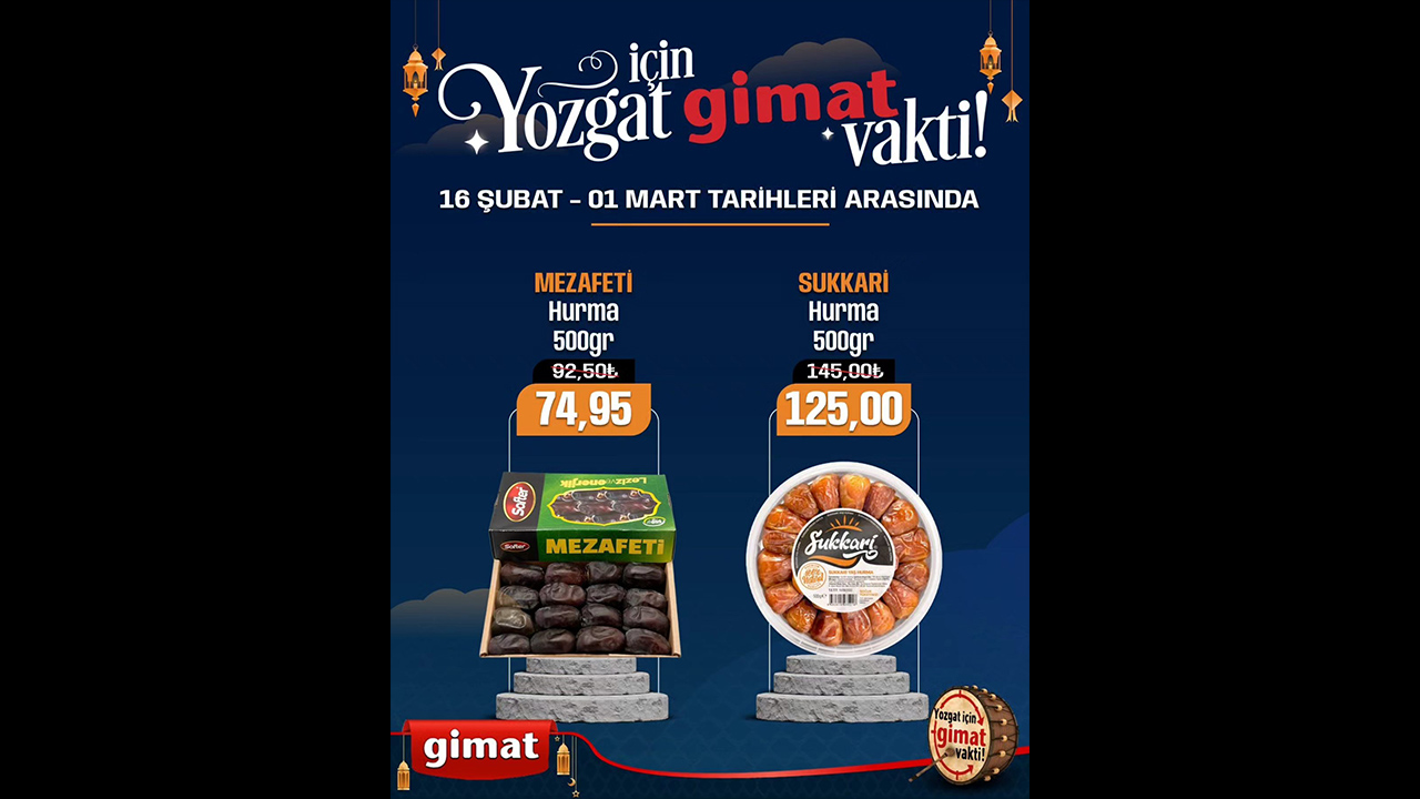 Gimat Mağazalarında yüzlerce üründe indirimler sizleri bekliyor. 16 Şubat 01 Mart arasında Ramazan ayına özel Mezafeti Hurma 500 gr 74.95 TL, Sukkari Hurma 500 gr 125 TL, Ravza Rebbi 400 gr 74.95, Ravza Hudri 400 gr 162,50 TL, Ravza Meşruk 400 gr 149.50 TL, Ravza Mebrum 400 gr 299.50 TL, Ravza Medjul 400 gr 239.50 TL, Ravza Saeedi 1000 gr 174.95 TL, Hurma Tasty Food 300 gr 29,95 TL, Tunus Hurmaa 300 gr 44.95 TL, Guryemiş Sarı üzüm 500 gr 129.50 TL, Guryemiş Nevşehir Çekirdeksiz siyah üzüm 500 gr 169.50 TL, Gurşemiş Besni siyah üzüm 500 gr 169.50 TL, Guryemiş Sarı erik 500 gr 189,50 TL, Guryemiş kayısı çiri 1000 gr 269.50 TL, Şekerpare Kayası 300 gr 129.50 TL, Knor hazır çorbalar 32.50 TL, Bizim hazır çorbalar 24.95 TL, Bizim Puding çeşitleri 27.50 TL, Ülker Bizim sos çikolata 98 gr 39.50 TL, Ülker toz Kakoo 49.50 TL, Dr oetker tavuk göğsü 2 adet kazandibi hediyeli paket 49.50 TL, Hamur Dr. Oetker kabartma tozu 15’li 34.95 TL, Kenton krem şanti 49.95 TL, knor bulyon 24’lü 69.50 TL, Bizim bulyon 37.50 TL, Kayra mantı 750 gr 44.95 TL, Saraşy mısır nişaşta 47.50 TL, kuru maya 29.50 TL, Kahve dünyası türk kahvesi 69.95 TL, Bizim paket margerin 6’lı 169.50 TL, Bizim terem paket 3’lü 99.95 TL, Terem Kase margarin 600 gr 109.50 TL, baharat çeşitleri ile satışa çıktı.