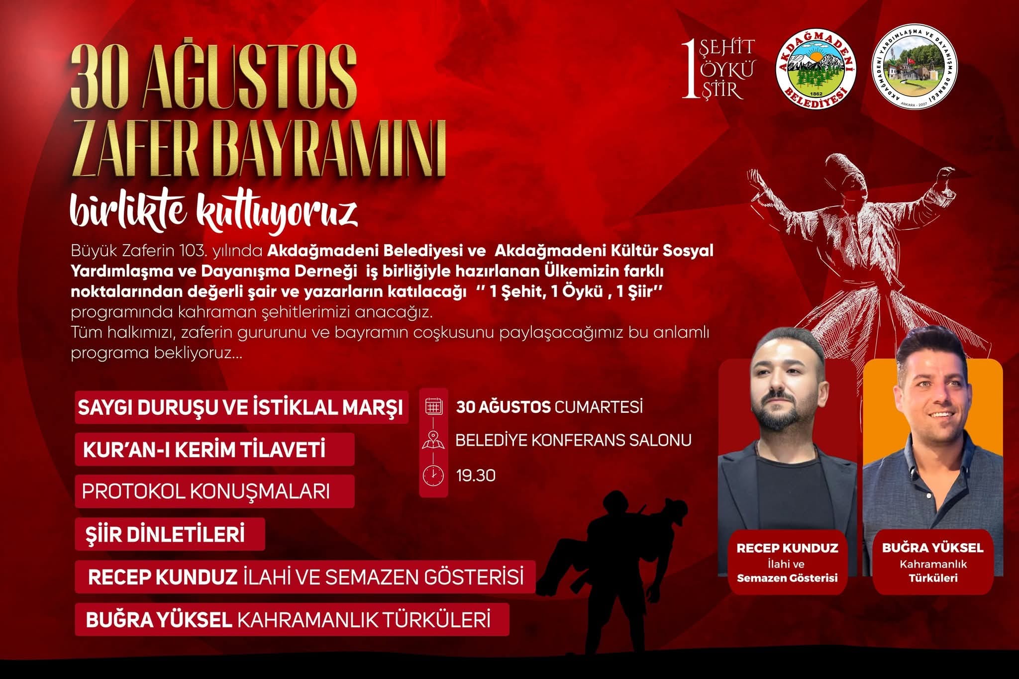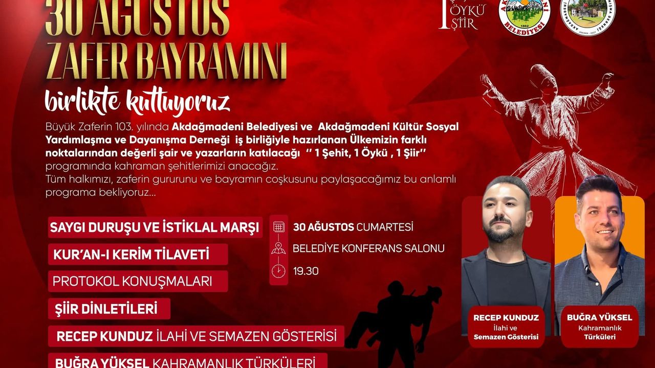 Akdağmadeni Belediyesi, tüm vatandaşları 30 Ağustos Zafer Bayramı’nın gururunu ve coşkusunu paylaşmaya davet etti. Etkinlik, 30 Ağustos Cumartesi günü saat 19.30’da Belediye Konferans Salonu’nda gerçekleştirilecek.