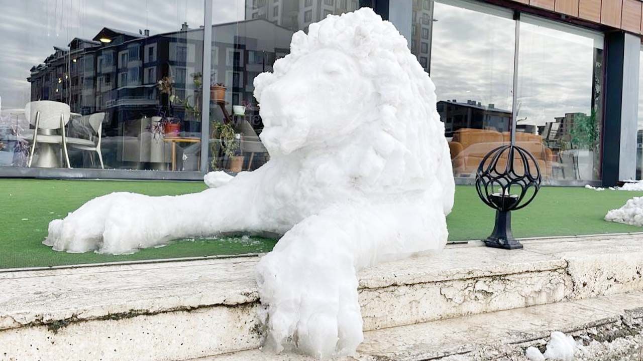 Yaklaşık 3 saat boyunca kaşıkla ince ince şekillendirdiği kardan aslan, hem detayları hem de gerçekçi görünümüyle vatandaşların yoğun ilgisini çekti.