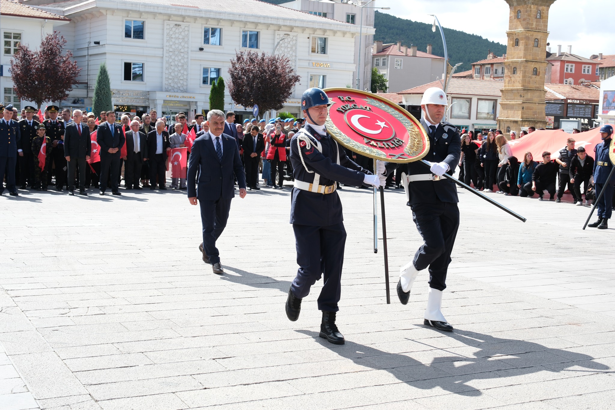 Cumhuriyet Meydanı’nda gerçekleştirilen törende, Atatürk Anıtı’na çelenk sunuldu. Saygı duruşu ve İstiklal Marşı’nın okunmasının ardından tören sona erdi.