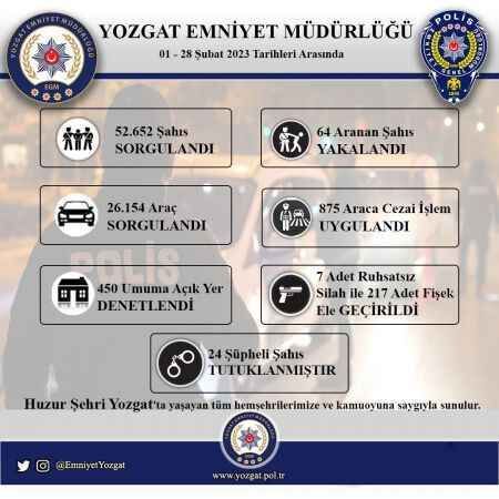 Emniyet Müdürlüğü tarafından yapılan açıklamada, "Yozgat İl Emniyet Müdürlüğü olarak 01- 28 Şubat tarihleri arasında yapılan uygulamalar ile şüphe ve ihbar üzerine yapılan çalışmalar sonucunda haklarında çeşitli suçlardan aranan 64 şahıs yakalanarak adli işlem başlatılmıştır. Yapılan işlemlerin ardından 64 kişiden 24 şahıs tutuklanarak cezaevine gönderilmiştir. Ayrıca 52 bin 652 şahısın GBT kontrolü yapılırken, 26 bin 154 araç sorgulaması, 875 araca cezai işlem, 450 umuma açık yer denetlenmesi yapılırken, 7 adet ruhsatsız silah ile 217 adet fişek geçirildi" ifadelerine yer verildi.