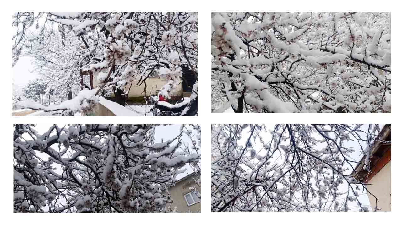 İlkbaharın gelmesiyle birlikte çiçek açan ağaçlar, beklenmedik kar yağışıyla beyaz örtü altında kaldı.