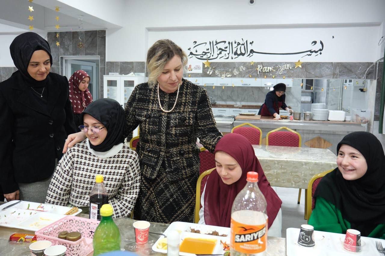 Yozgat Valisi Mehmet Ali Özkan’ın eşi Arzu Özkan ile Necmettin Koç’un eşi Tuğba Koç, Bölge Yatılı Kız Kur’an Kursu’nda hafızlık eğitimi alan öğrencilerle iftar programında buluştu.
