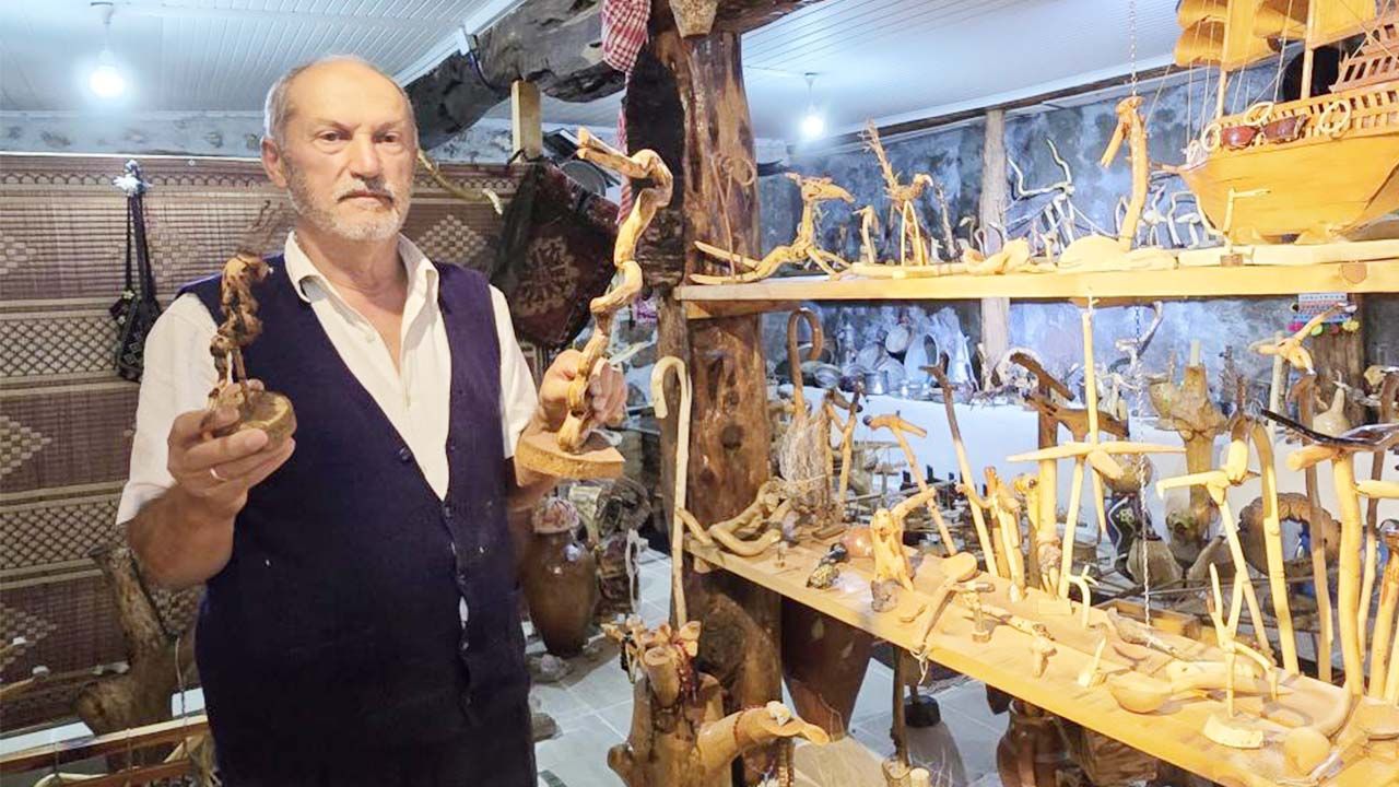 Emekli olduktan sonra memleketi Yozgat’ın Aydıncık ilçesine bağlı Kösrelik köyüne yerleşen Raşit Öztürk, doğadan topladığı ağaç kökleri, odun parçaları ve doğal malzemeleri kullanarak baston, kağnı ve hayvan figürleri gibi el işi sanat eserleri üretiyor.
